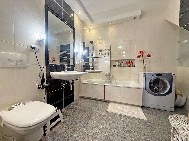 Łazienka z wanną, na ścianach glazura, na podłodze granit.