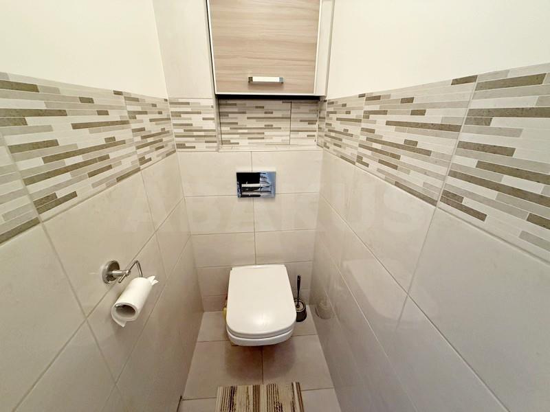 Oddzielna toaleta, na ścianach glazura, na podłodze terakota.
