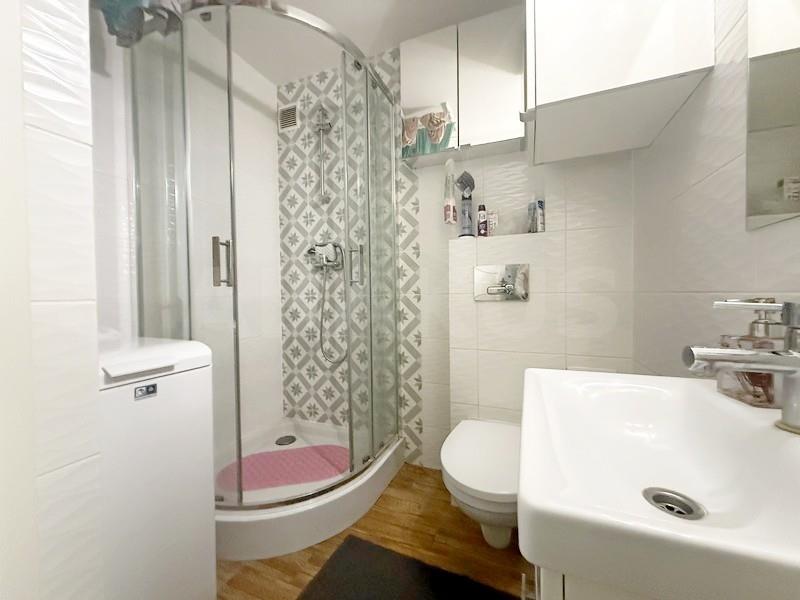 Łazienka z kabiną, na ścianach glazura, na podłodze terakota.