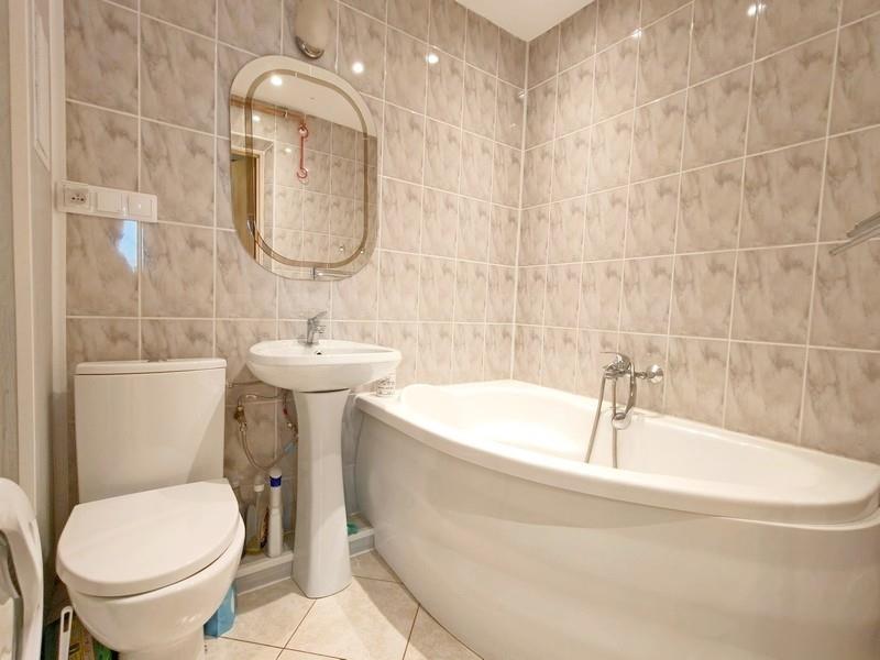 Łazienka z wanną, na ścianach glazura, na podłodze terakota.